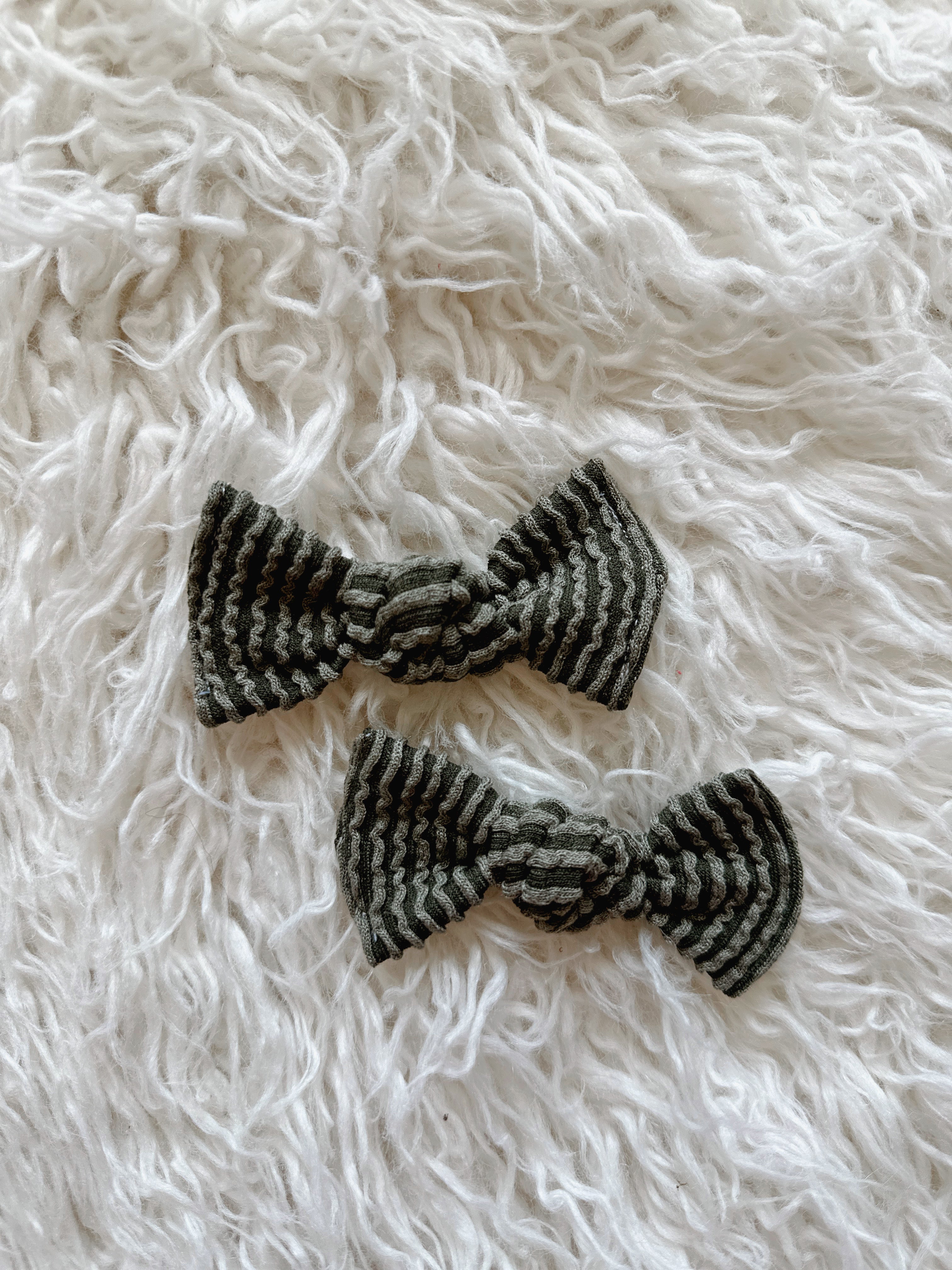 - 3” hand-tied bows crafted from soft, ribbed knit fabric