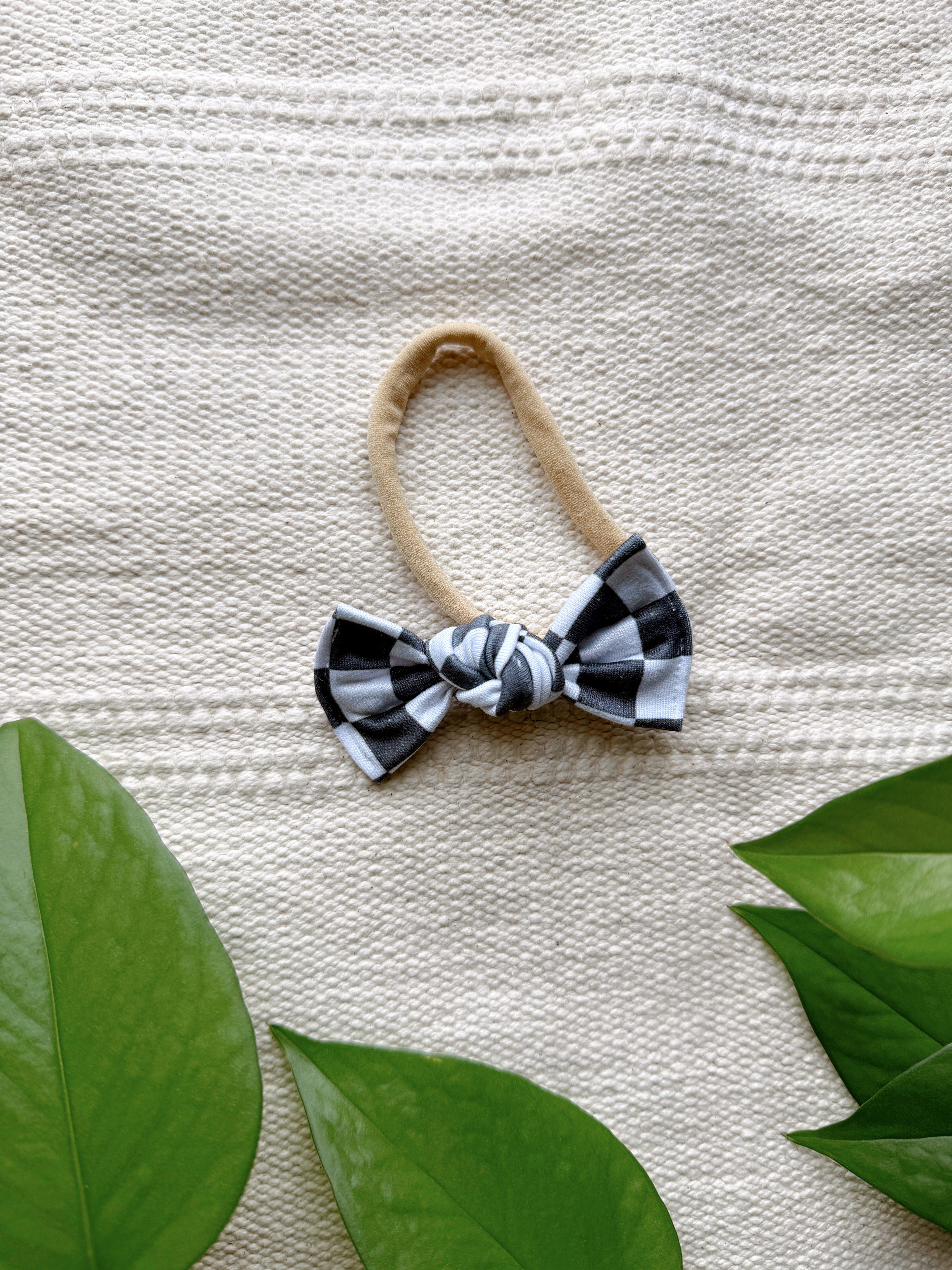 This thin stretchy nylon band will fit newborn - 12mo comfortably. Features a 3” sewn, hand tied bow.